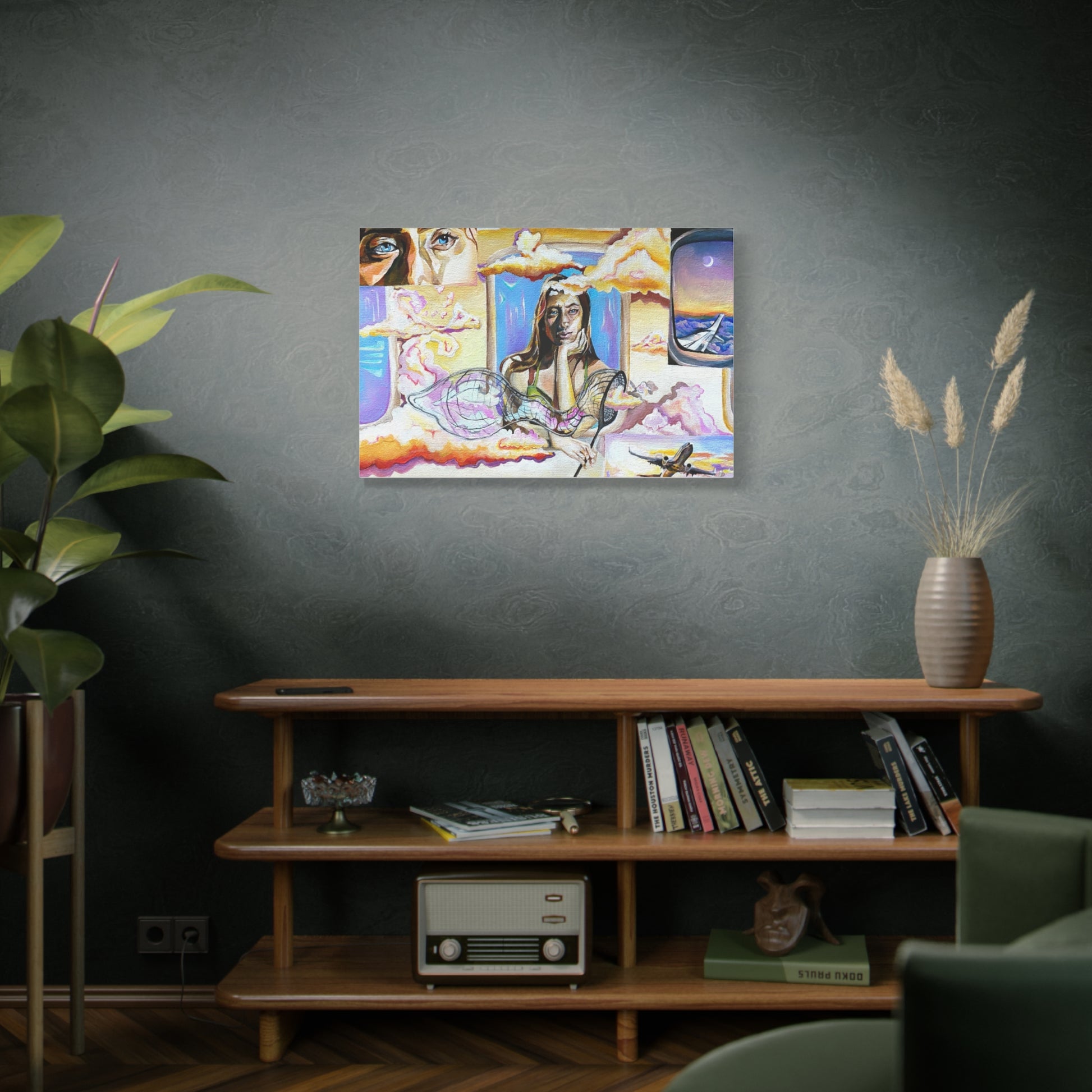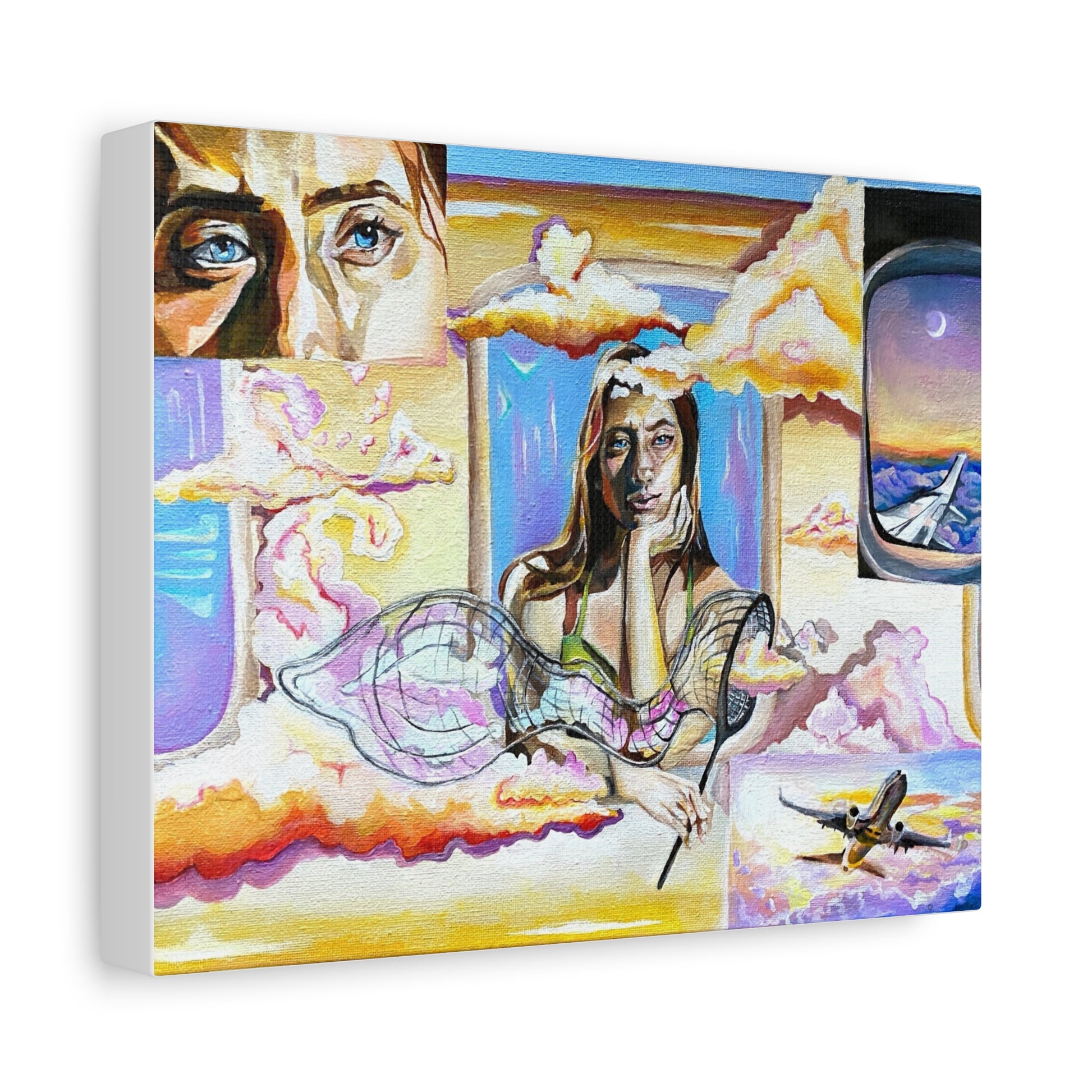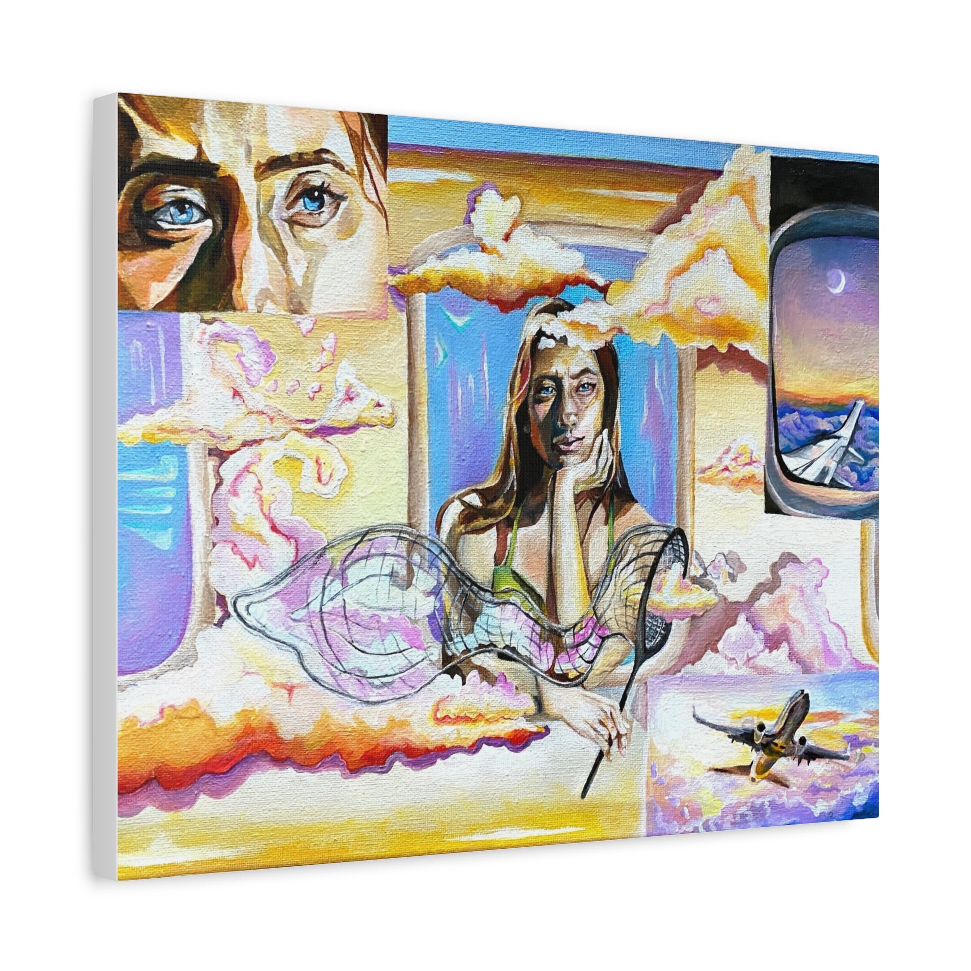 Acrylic painting of a surreal self portrait. I dreamed up this composition of a person catching the clouds out of an airplane. This painting plays on the saying “head in the clouds” while day dreaming. The beautiful thing about surrealism is you can make the impossible possible. I would often daydream of being with the clouds while gazing from the ground. This painting brings those dreams into reality of wanting to be up there with the clouds.